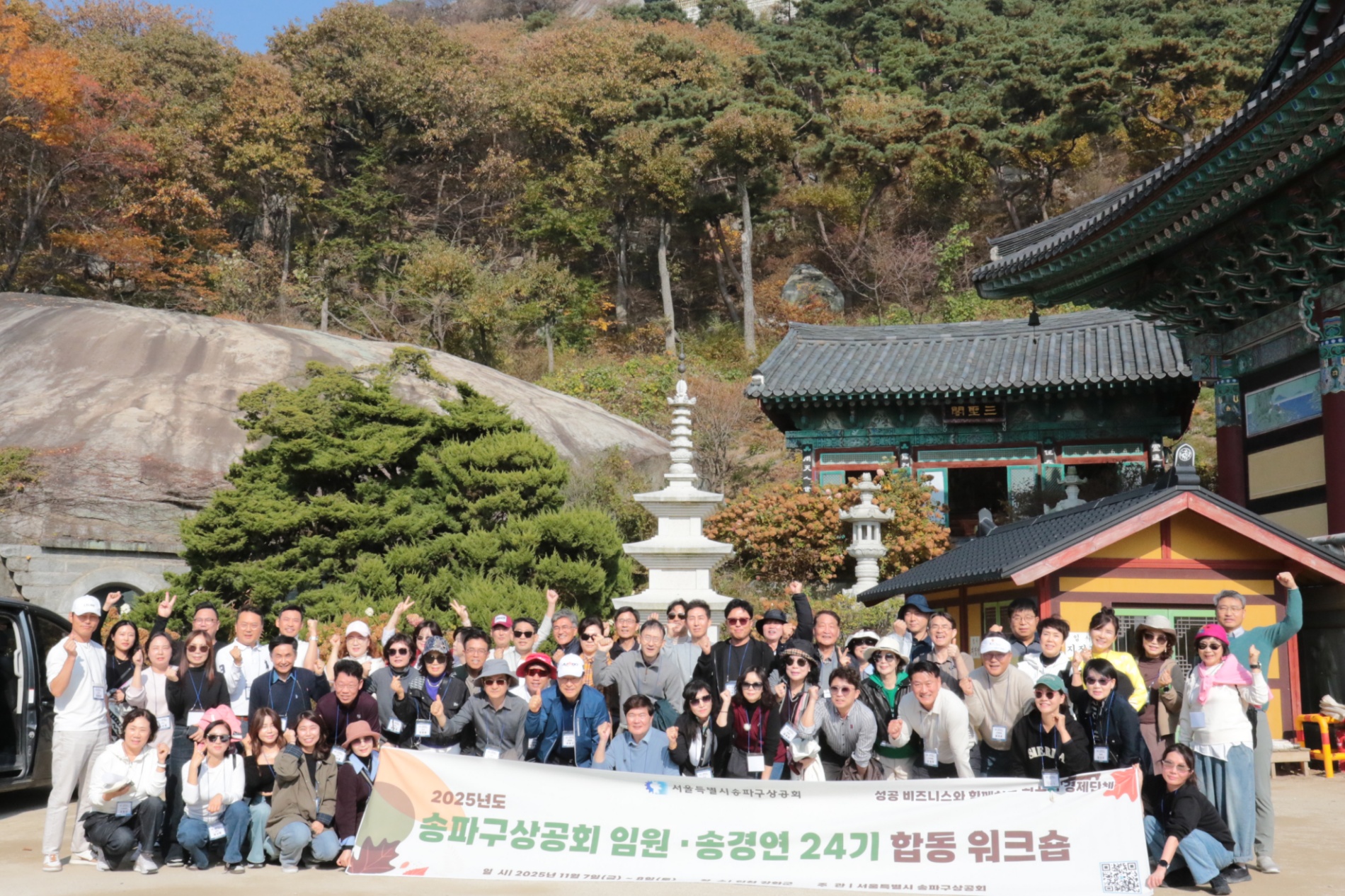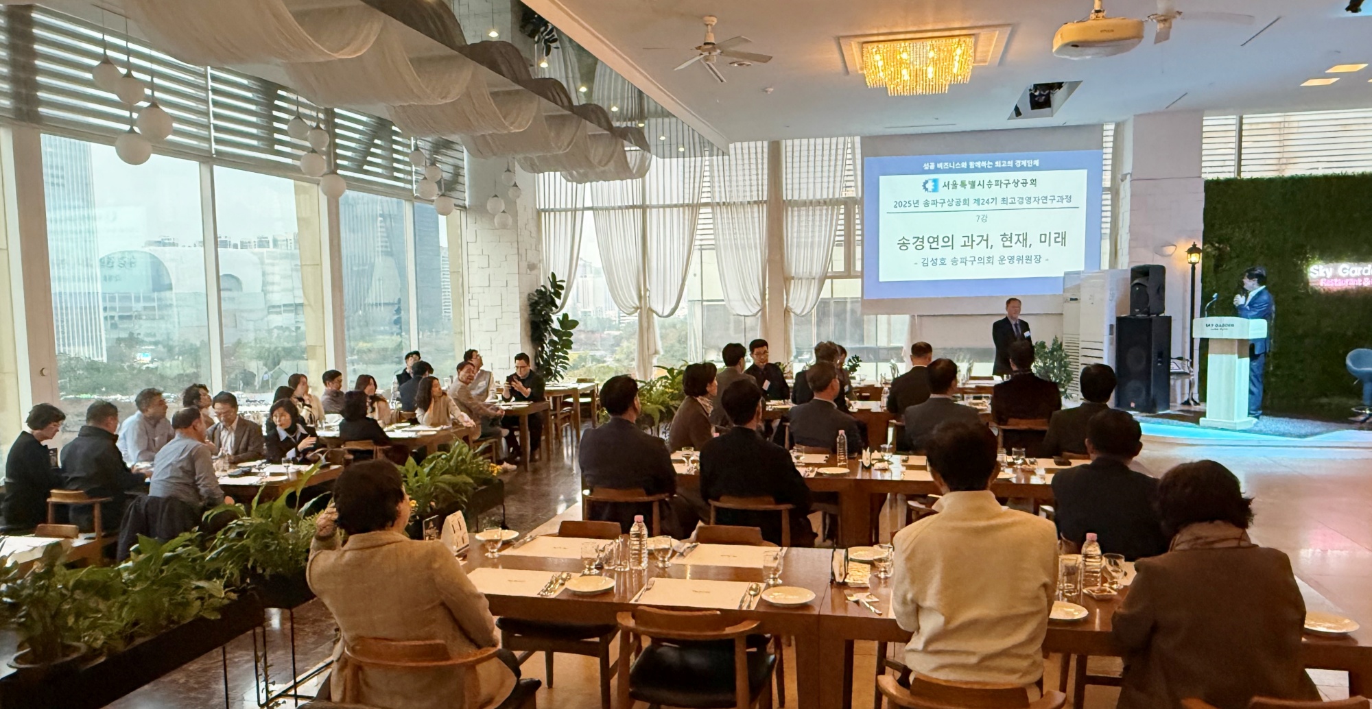 송파구상공회(봉유종 회장)는 11월 21일(금) '2025년도 송파구상공회 제24기 최고경영자연구과정'의 마지막 수업인 10강을 진행하고, 수료식을 개최했습니다. 올해 제24기 최고경영자연구과정에는 송파구 소재 사업체 임직원 및 중소상공인 70여 명이 등록했습니다.10강에서는 고종완 한국자산관리연구원장이 '2026 부동산 전망 및 과학적 자산관리'를 주제로 강연을 진행했습니다. 강연 종료 후 '2025년도 송파구상공회 제24기 최고경영자연구과정' 수료식을 개최했습니다. 수료식에서는 24기 회장인 '이종찬 엘로라인가든웨딩앤호텔 회장'과 24기 사무총장인 '유성용 해피마이다스주식회사 대표이사'가 24기 대표로 '수료패'를 받고, 류지용 송파세무서장을 포함한 13명이 '개근상'을 받았습니다.최고경영자연구과정은 매년 9월부터 11월까지 10회 가량 진행되는 송파구 관내 최고경영자를 위한 교육과정으로 2004년부터 개설해 운영해 오고 있습니다. 총 23회 교육 수료를 통해 송파구 소재 5,200여 개 회원사와 1,100여 명의 CEO들이 최고경영자연구과정을 수료하는 등 두터운 인적 네트워크를 쌓으며 외연을 확장하고 있습니다.* 2026년 송파구상공회 제25기 최고경영자연구과정 문의 : 송파구상공회 사무국(02-412-3830)